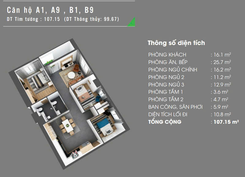 Diện tích căn hộ: 75–107m², sở hữu sổ hồng lâu dài